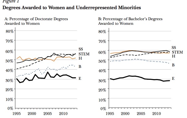 It seems that Econ is doing much worse than many other fields (see Figure 1 from their paper below, where Economics (E), Humanities (H), Social Science (SS) Business (B) STEM (STEM)